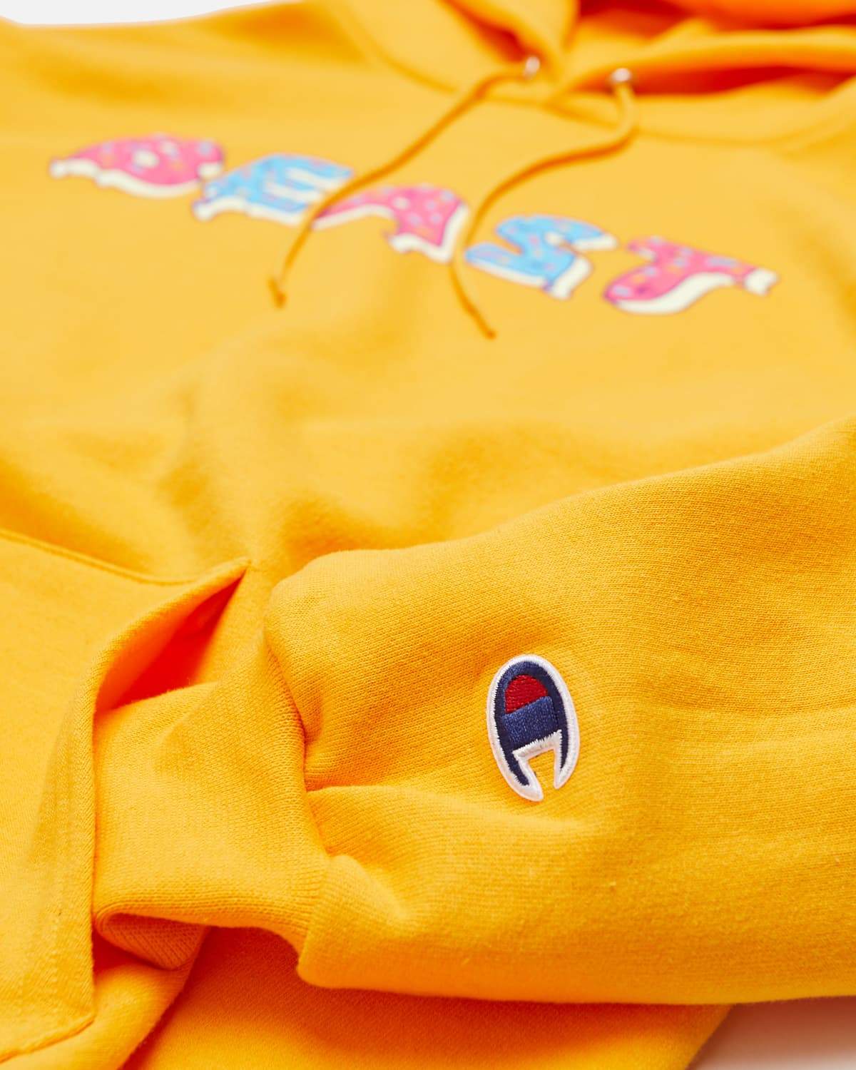 • Printed on a gold, 50% cotton, 50% polyester Champion pullover hoodie