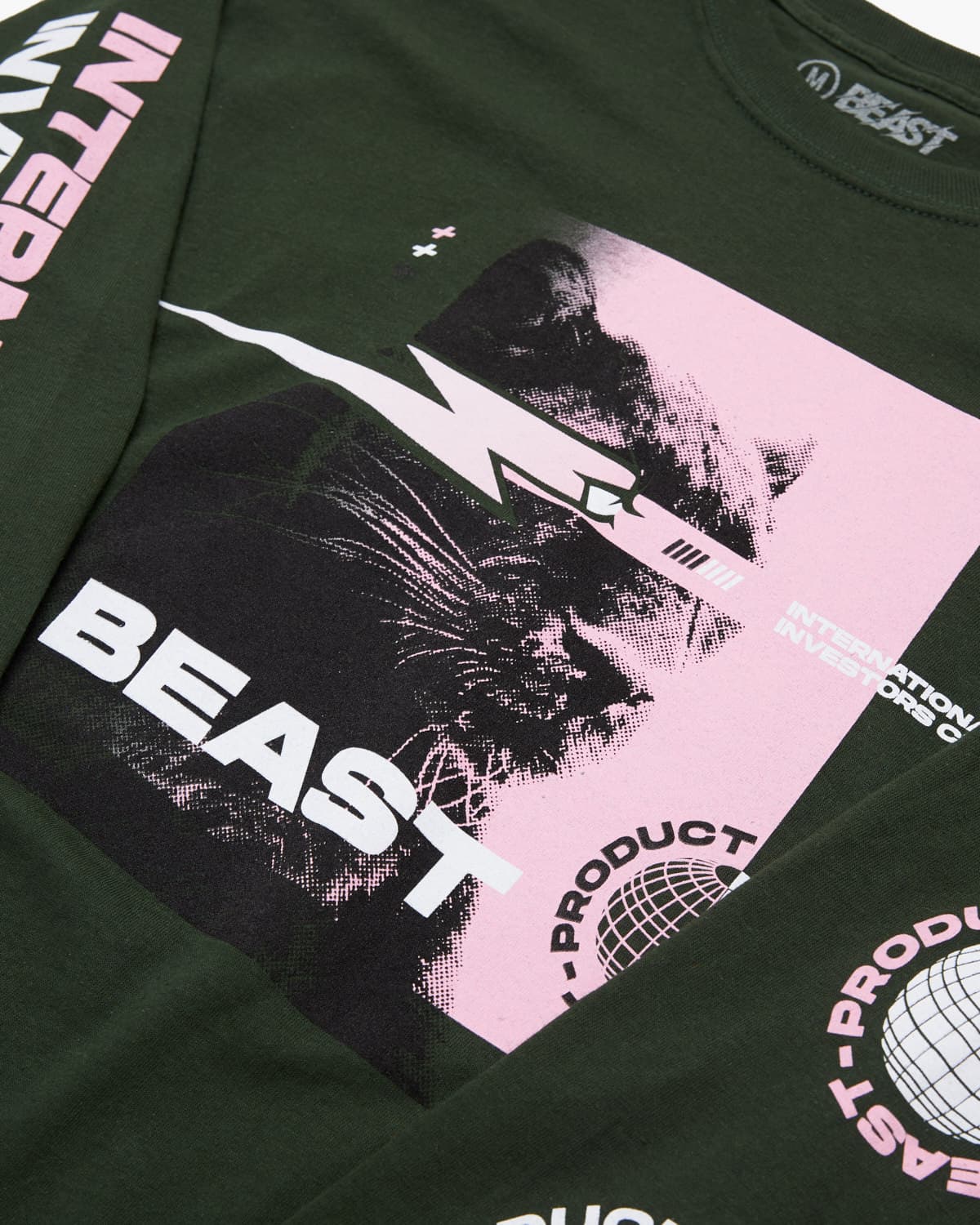 • Printed on a forest green, 100% cotton long sleeve tee • Printed with soft hand inks so print is soft to the touch • Front and dual sleeve decorations • Custom printed neck/size tag • Shoulder to shoulder taping • Double needle stitching throughout